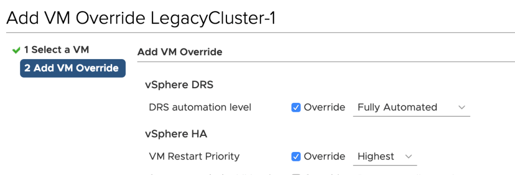 | Automation Level | Fully Automated, Partially Automated, Manual | If the DRS configuration Fully Automated , the VM Override settings should be applied. If the DRS settings are Partially Automated or Manual, the VM Override settings are not necessary. |