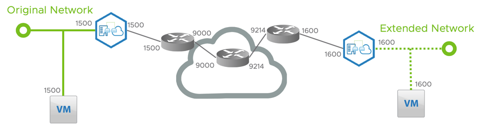 Any two communicating virtual machines use their interface MTU setting to negotiate the maximum size of any data segment. The virtual machines use their own interface MTU as a basis for this negotiation, but have no awareness of northbound MTU values, or of any encapsulation or tunneling operations along the way.