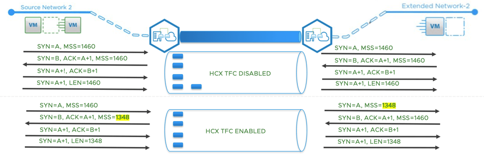 - HCX Network Extension intercepts the TCP handshake and adjusts the Maximum segment dynamically. In this scenario, the maximum segment is set to 1350 instead of 1500.