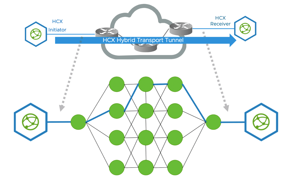 The HCX Interconnect and Network Extension transport in HCX Enterprise take advantage of these existing multi-path hashing behaviors to achieve a powerful improvement. HCX Application Path Resiliency technology creates multiple FOU tunnels between the source and destination Uplink IP pair for improved performance and resiliency and path diversity.