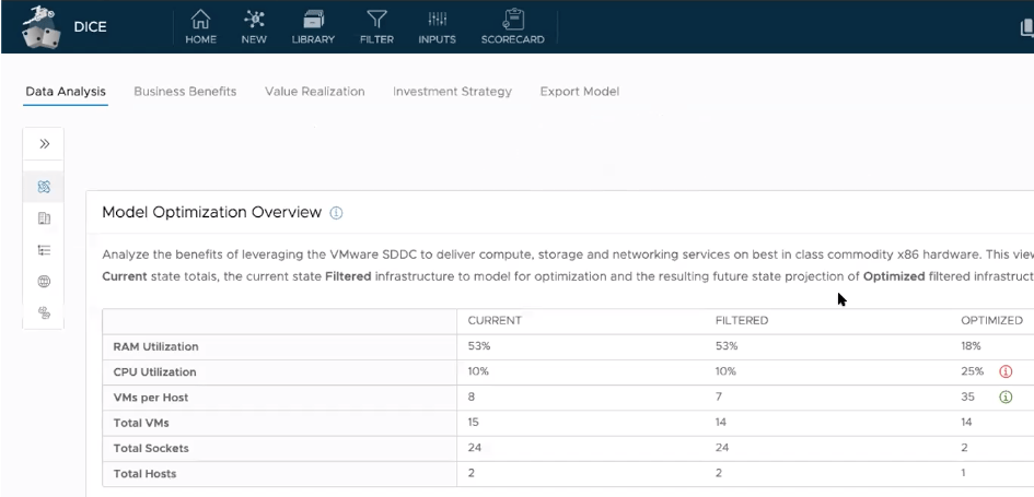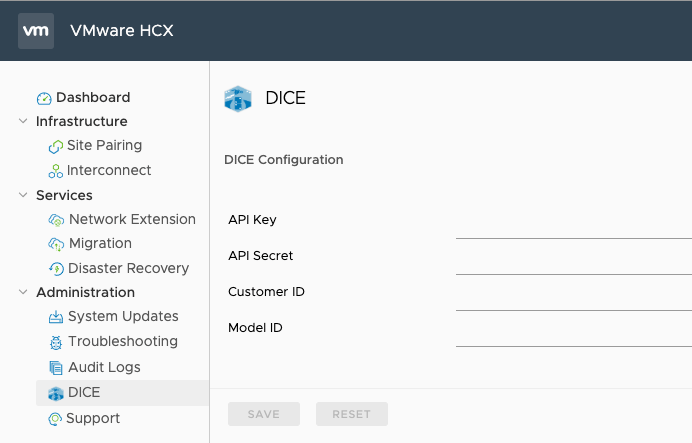 The Data Integrated Customer Engagement (DICE) tool uses customer utilization data to model the business benefits of VMware’s software-defined data center (SDDC) products. Through DICE integration, you configure the HCX interface to upload the virtual appliance and host inventory of the vCenter that is registered with the HCX Manager.