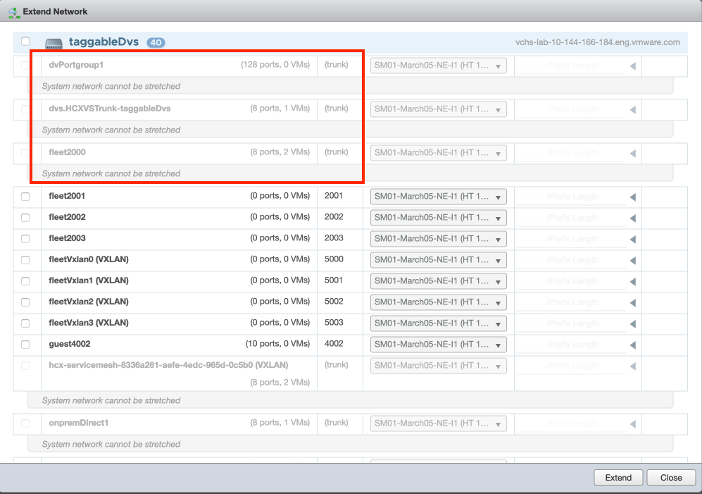 HCX Network Extension supports various types of virtual machine networks at the source environment. These networks are bridged to NSX Segment (or Logical Switch in NSXv). With HCX R138, the Network Extension operation will prevent a user from extending the following unsupported vSphere network types, which are not meant to be within the scope of HCX Network Extension: