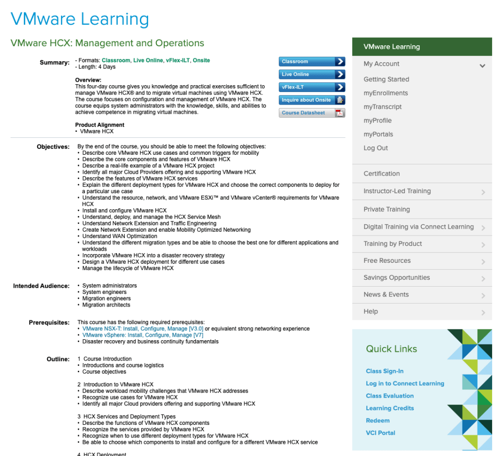 “This four-day course gives you knowledge and practical exercises sufficient to manage VMware HCX and to migrate virtual machines using VMware HCX. The course focuses on configuration and management of VMware HCX. The course equips system administrators with the knowledge, skills, and abilities to achieve competence in migrating virtual machines.”