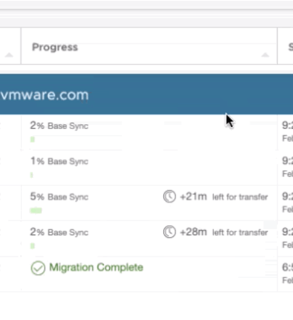Real-time Migration Estimates for Bulk Migration (from HCX 4.0) provides a “time to completion” for migrations in progress, during the transfer phase (the full synchronization of the virtual machine disks, before we transition to copying VM changes). The time is provided on the right side of the progress column, in the migration interface. Here’s what that looks like: