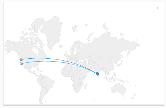 The HCX dashboard has a location widget that visualizes connected clouds and data center environments on a world map. The intention is to give a user a big picture visual of what is encompassed (geographically) in the overall HCX implementation: