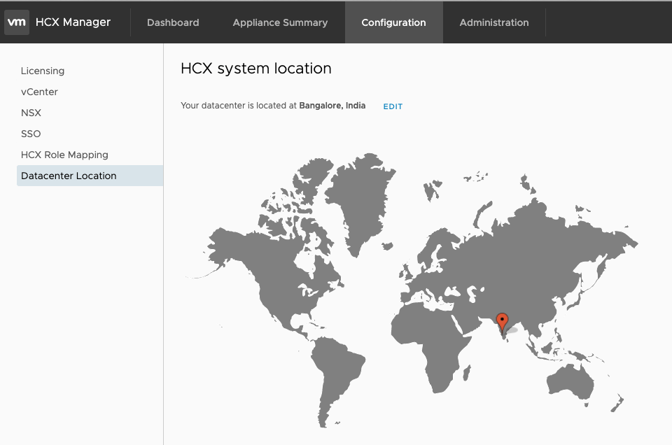 The location of an HCX Manager system is initially provided during the installation (shortly after the appliance is activated) and can be subsequently managed in the HCX AMI (the 9443 UI).