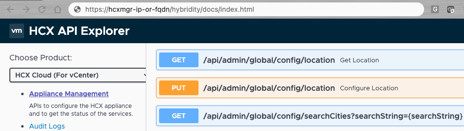 There are APIs available for configuring the location, for querying a configured location, and for searching the HCX appliance for valid cities.
