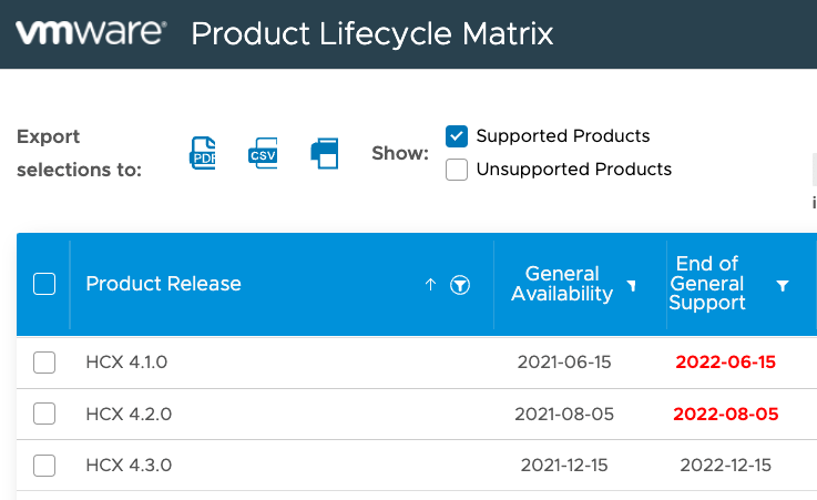 Please note that End of Support is in the horizon for versions 4.1 and 4.2. HCX adheres to the VMware N-2 Policy which is a fancy way to say two things: