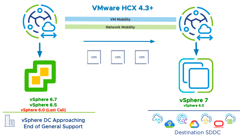 VMware HCX can be used for the evacuation of legacy vSphere environments. In this context, legacy refers to vSphere versions that have reached End of General Support, are within one year (in either direction) of the End of Technical Guidance*