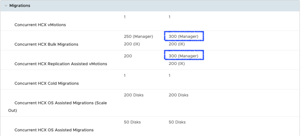 The maximum supported concurrent replication-based migration operations per HCX Manager have increased to 300 in HCX 4.5.