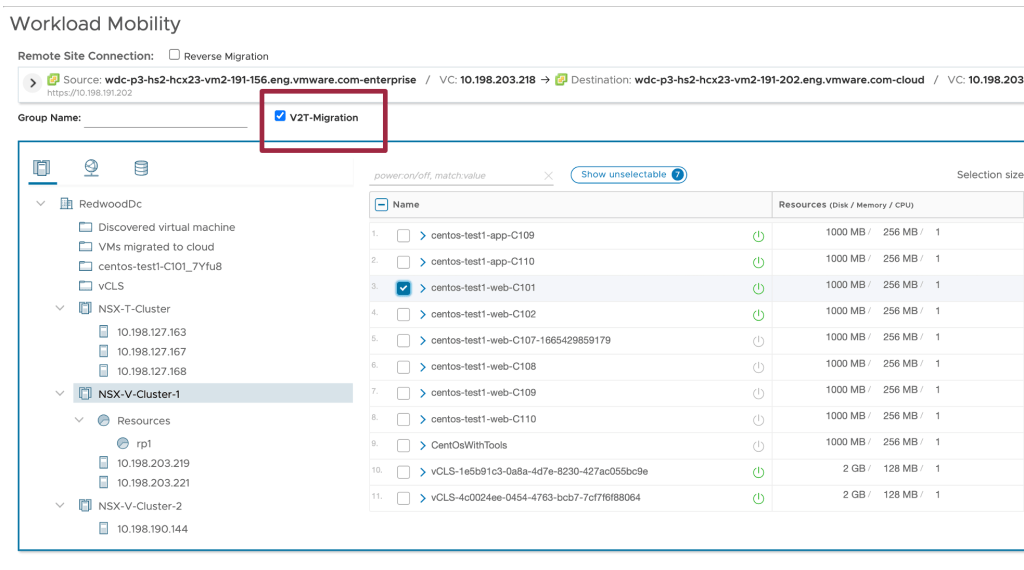 This new migration option eliminates the need to run multiple complicated APIs during a V2T lift-and-shift. HCX mobility groups in V2T mode