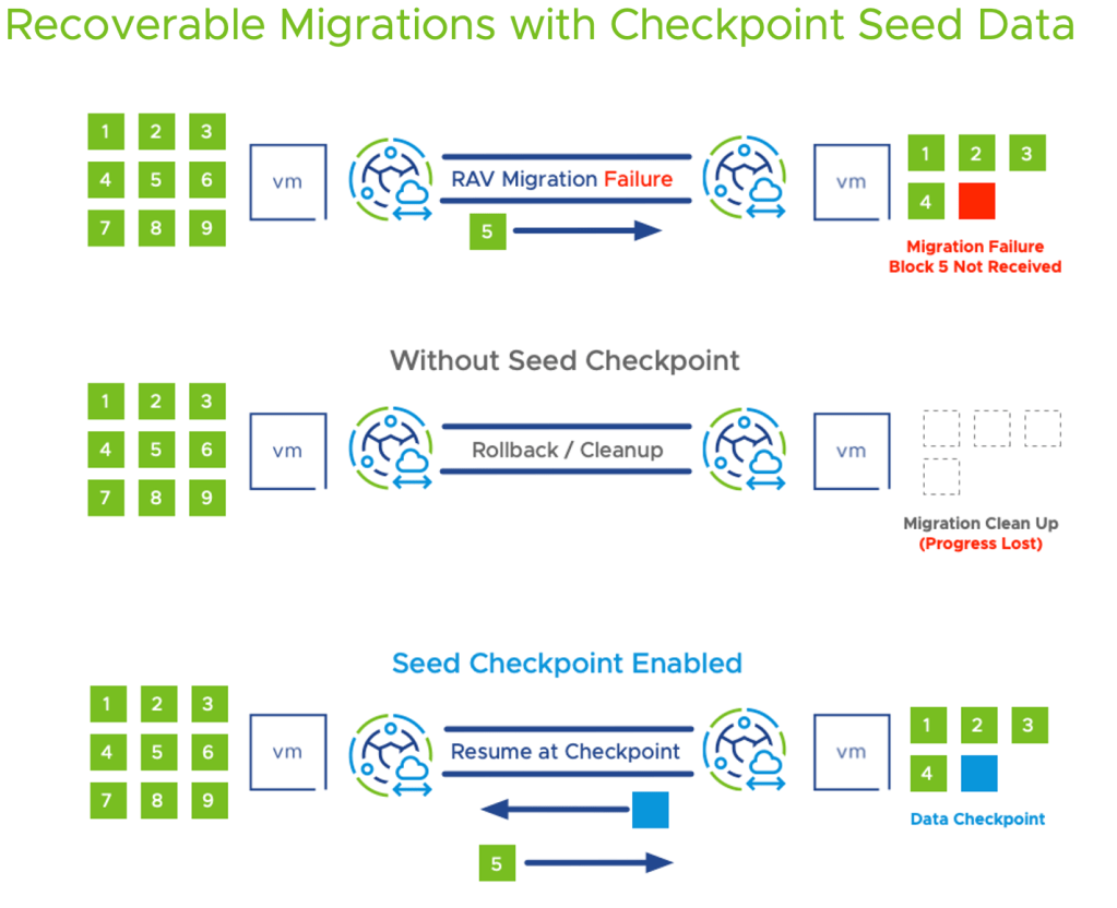 Seed Checkpoint provides recoverable migration progress. An option for retaining replica disks at the target datastore if a migration is failed or cancelled. Seed checkpoints enable HCX to reuse the disks on the target for seeding migration replication data, avoiding the need to re-transfer all the data from scratch.