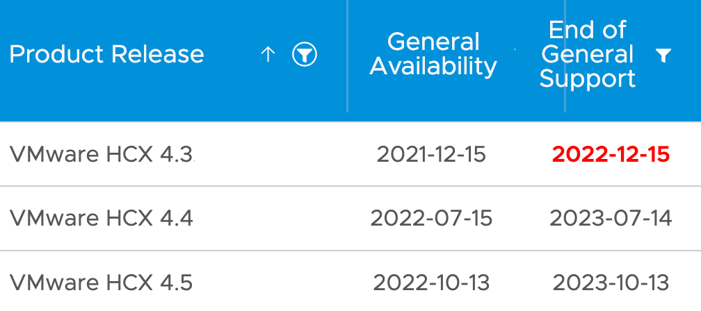 About 32% of installations in the wild are running HCX 4.3 (4.3.1 – 4.3.3). Heads up on End of Support, for these systems it arrives at the end of this year. There is no Technical Guidance phase for HCX.