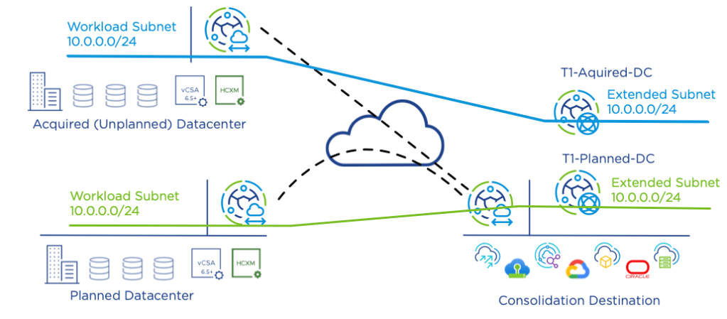 Use HCX Network Extension with multiple Tier-1 routers for tenant separation of overlapping networks. Workloads can be consolidated without clashing without a separate re-IP project.