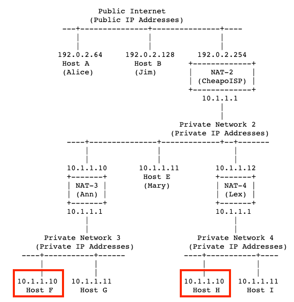 The Internet was originally designed to use a single, global 32-bit IP address space to uniquely identify hosts on the network, allowing applications on one host to address and initiate communications with applications on any other host regardless of the respective host's topological locations or administrative domains. For a variety of pragmatic reasons, however, the Internet has gradually drifted away from strict conformance to this ideal of a single flat global address space, and towards a hierarchy of smaller "private" address spaces [RFC1918] clustered around a large central "public" address space. [RFC5684] Srisuresh, P. and B. Ford, "Unintended Consequences of NAT Deployments with Overlapping Address Space", RFC 5684, February 2010. http://www.ietf.org/rfc/rfc5684.txt
