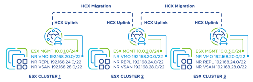 A multi-arm HCX service can establish a migration path on behalf of every cluster. Configurations do not need to be changed.