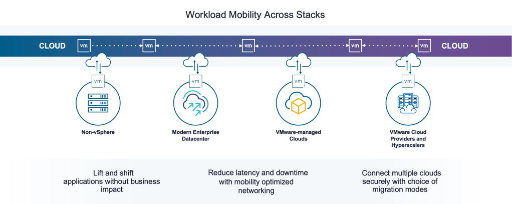 VMware by Broadcom’s workload mobility workhorse, providing easy to use options for connecting many types of technology stacks, connecting traditional VLANS and modern workload overlays with a few clicks, and deploys multiple migration technology options. HCX can connect fully isolated vSphere Replication & vMotion networks, it allows cross-CPU vendor migration, and workload modernization at the largest scale. HCX technology is available with VMware Cloud Foundation.